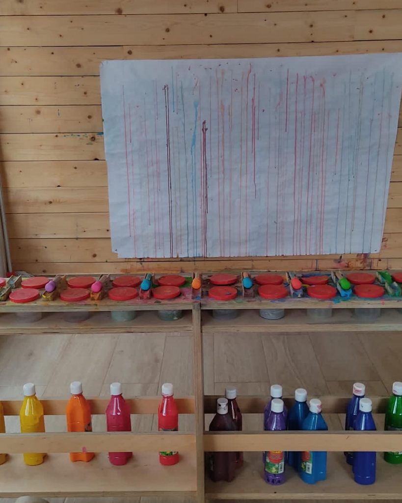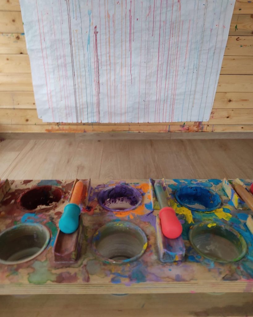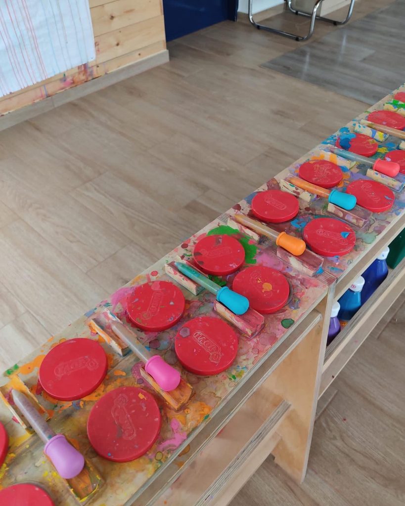 La parte positiva de nuestras #MesasPaleta es que, además de aportar orden al espacio y facilitar la expresión, admite diferentes tamaños de pocillos o vasos donde depositar la pintura, ya que al tener una balda justo debajo de la parte superior hace que queden apoyados y seguros.